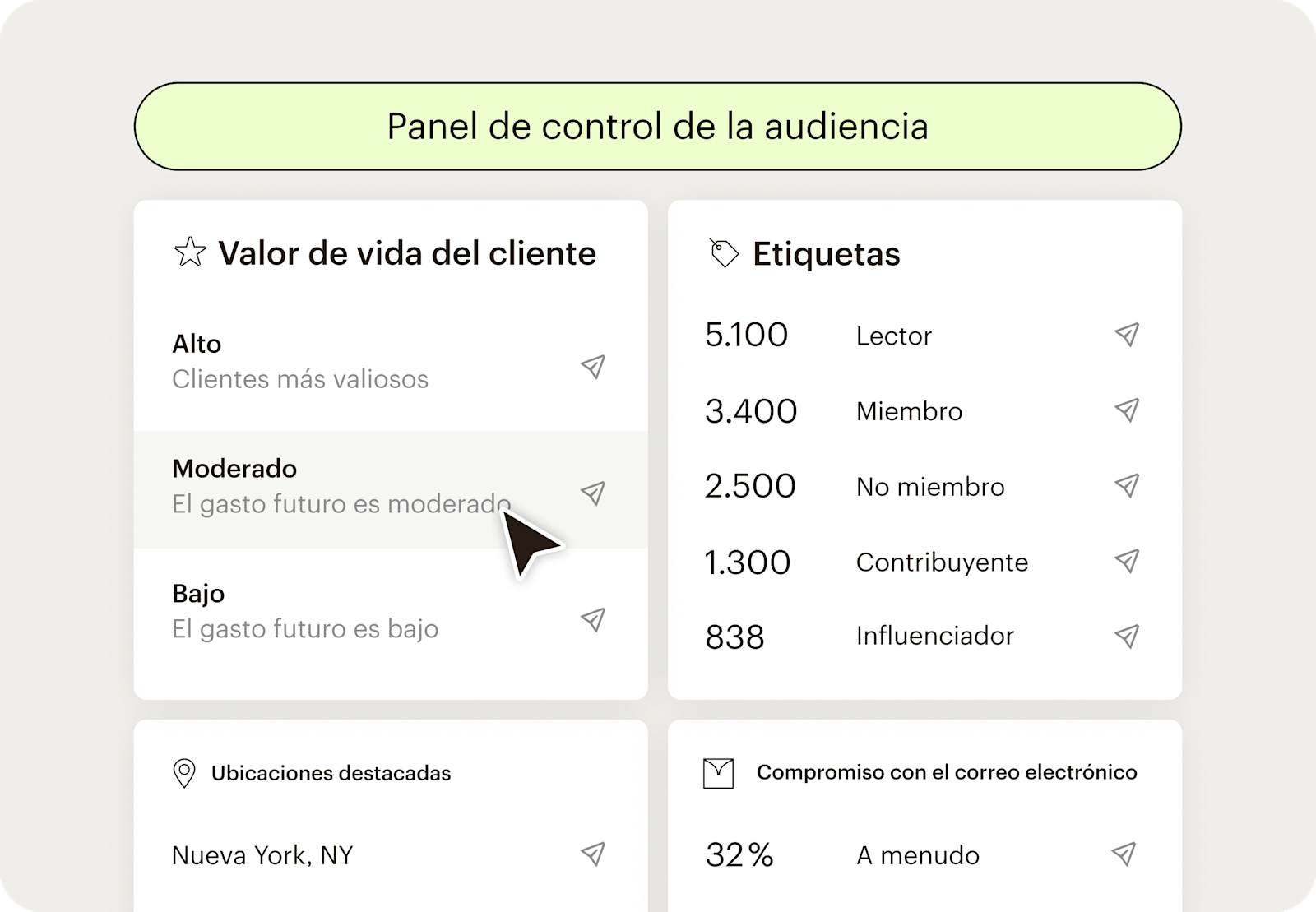 Las herramientas de público de Mailchimp te ayudan a almacenar, segmentar y comprender a tus clientes para ofrecer las experiencias personalizadas más relevantes.