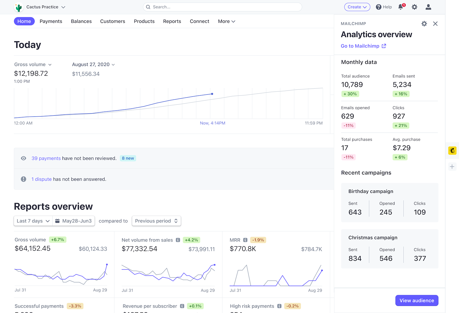Send branded, personalized email campaigns or automated messages to people who have purchased from you. Customers and subscribers are automatically added to your Mailchimp audience so you can quickly segment and send relevant messages to an engaged audience, and view your Mailchimp Store performance data in the Stripe dashboard.